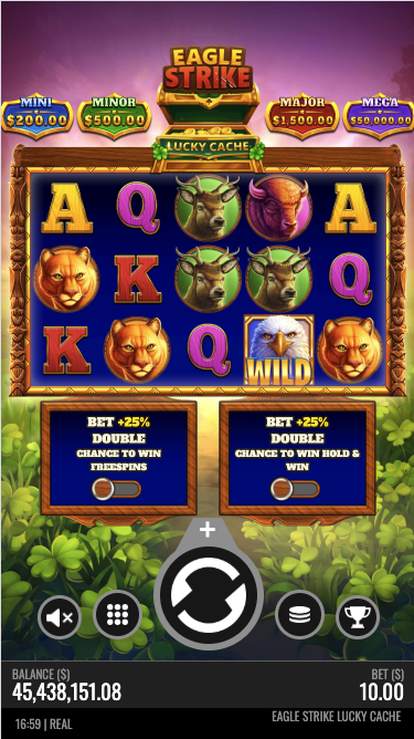 Meet Eagle Strike Lucky Cache, an exciting 25-line slot from Iron Dog Studio that takes players to an enchanting green canyon teeming with exotic wildlife and of course the powerful eagle, guardian of the leafy valley. Key Features: Hold & Win, Freespins, Expanding Wilds. In Eagle Strike Lucky Cache the scenery gives off a majestic aura with vibrant colours and sharp graphics. Watch as the treasure chest at the top of the reels collects all the coins landed and rewards them to players when full. The anticipation builds up once 6 coins are landed, triggering Hold & Win. The player is granted 3 respins during which Mystery Coins may land on the reels awarding Jackpots at the end of the mechanic.