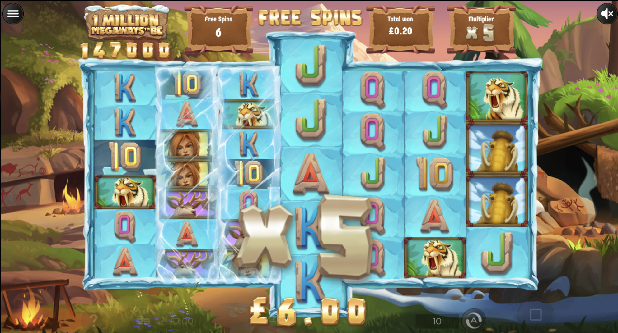 Free spins start with the ground trembling and the reels shaking, as they make way for the prehistoric “Mammoth Reel”, an additional reel which, when caught, expands to a frightening height of 9 symbols! It also adds an additional multiplier, 5 extra spins, and Sticky Wilds!