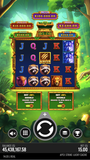 Are you a wild animal lover? Then this slot is for you! Set in a hidden forest far, far away, Apex Strike Lucky Cache takes you on an exciting adventure featuring an array of majestic wild animals—from pumas to deers—all helping you score incredible payouts along the way!