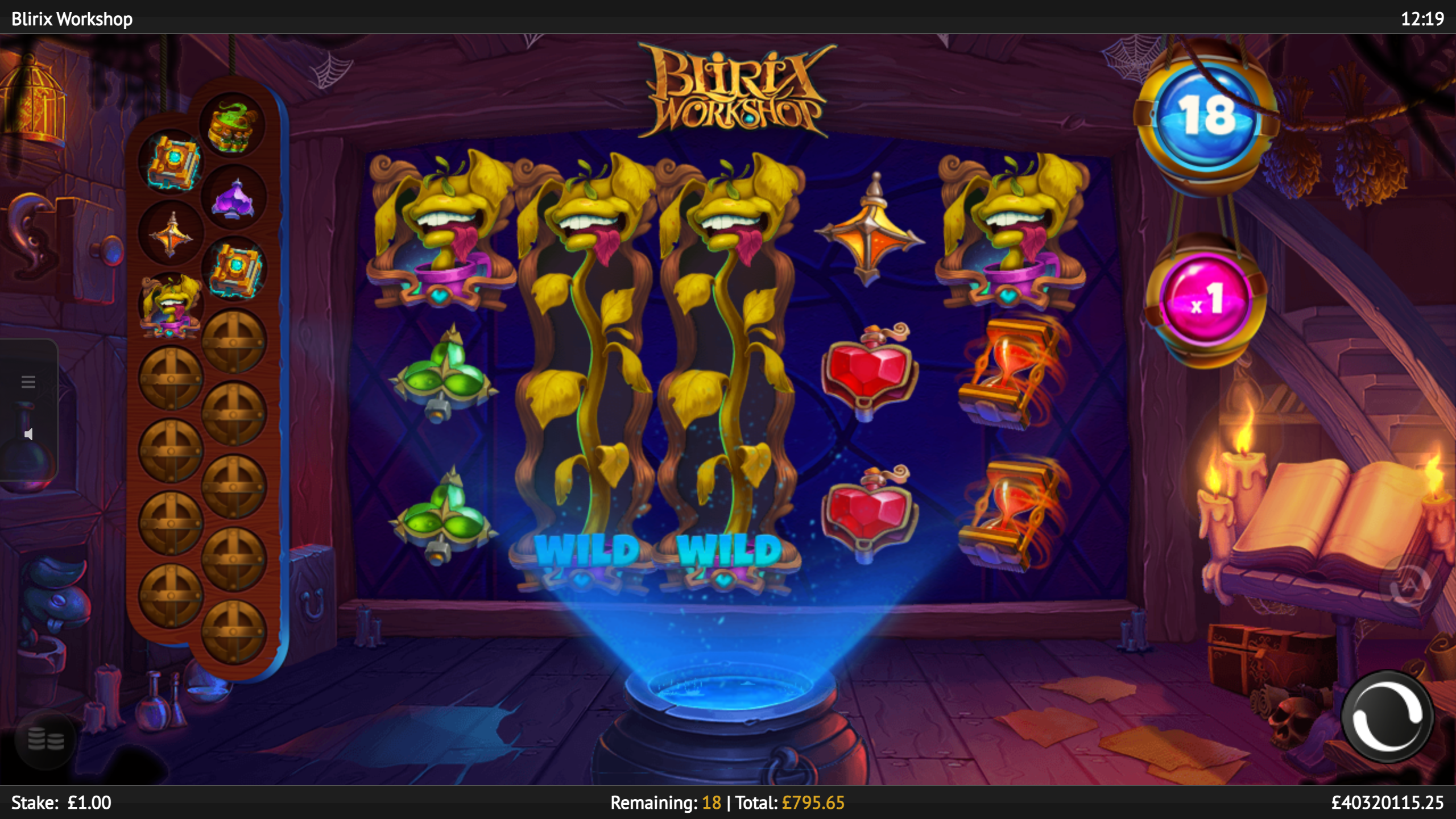 You can throw in between 0.2 and 50 gold pieces, sometimes it works extremely well with rather high volatility. But other times, I’ve had some… Strange results. The kind of strange results where a large flower with a head on it grows out of the cauldron and expands on the reel and acts as an expanding wild! What? Don’t look at me like I’m insane! I’m Blirix! And this is my workshop! GOOD GRACIOUS be careful with that book! Give it here. This Magic book has a number of my favourite spells in it. Some will multiply wins on non special symbols, others will make wilds appear out of thin air, others can even transform random symbols into duplicate symbols to get the Mega Wins! But most importantly, if you can help me find between 3 and 5 of my special scatter symbols I’ve lost somewhere here in this workshop, I can throw those into the cauldron and you can have upto 15 Free Spins! And of course if I have this book of mine handy I can even add more and more spells to the mix so you can win upto x7000 times your stake!!