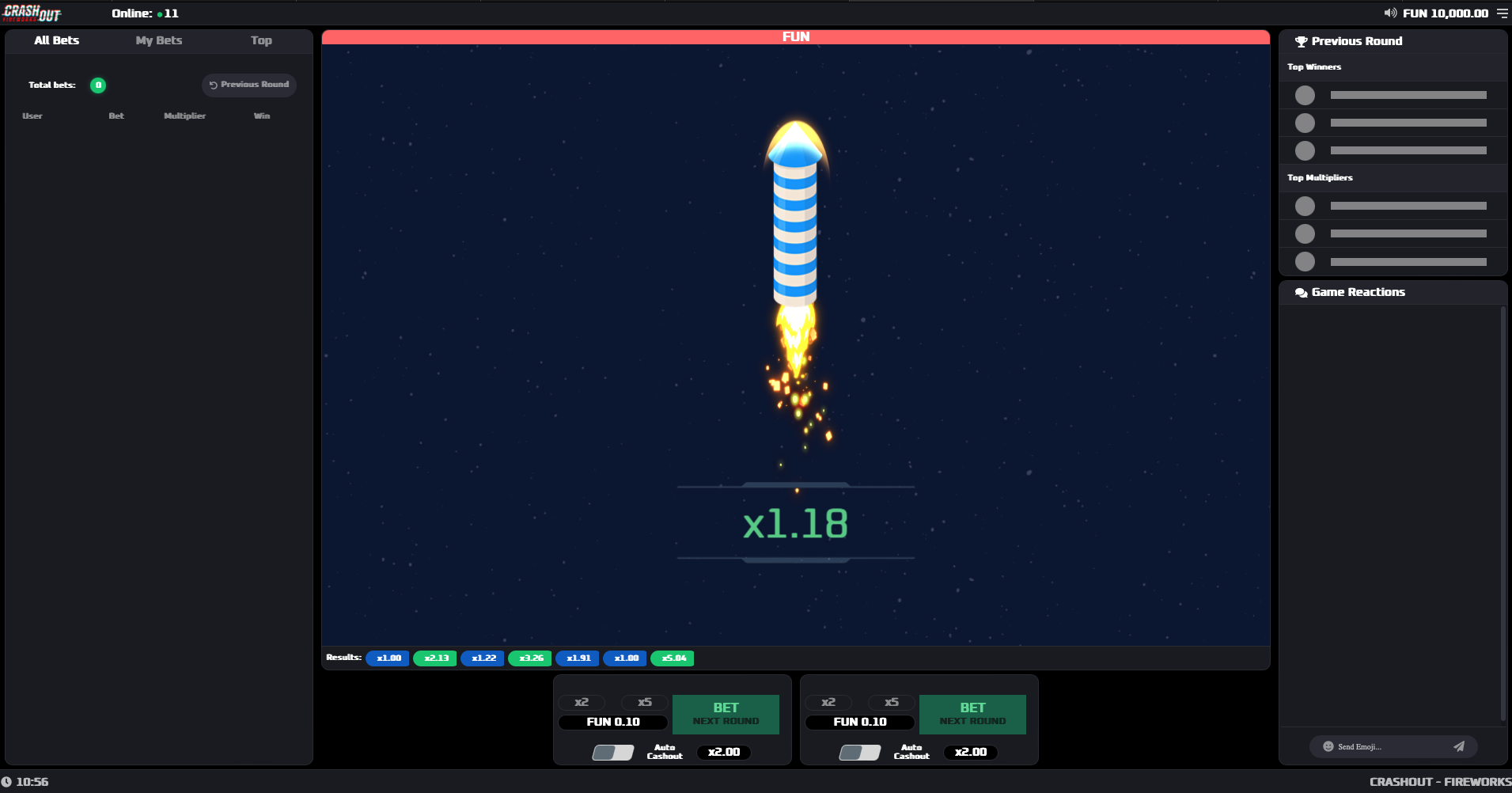 Crashout - Fireworks presents not only an original and exciting addition to the 1X2gaming offering but also a new concept in the iGaming market. Crash games have seen a boon in popularity in the last few quarters, and this title from 1X2gaming adds a social multiplayer element to the players' experience. Crash game mechanics are a unique experience in any casino lobby, fully centralising the gameplay on player choice. In Crashout - Fireworks, players follow the titular rocket as it soars through the sky towards its inevitable explosion. As it flies, the firework pushes the multiplier up with it, exponentially multiplying players' stakes before crashing. Crashout - Fireworks provides players with an intuitive user interface, at the centre of which is a dual betting console, where players can set auto-bets and auto-cashouts as well as easily increase their bet via quick x2 / x5 multipliers. This UI also includes a chat box with a host of emoji reactions for players to enjoy; as well as tracking of previous multipliers, biggest wins, overall bet history, and the individual player's bet history for that session.