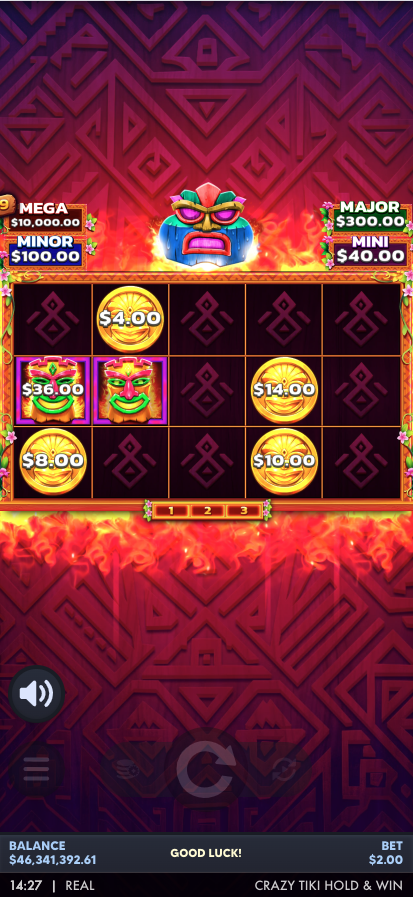 During Hold & Win, supernatural Collectors gather the values of all special symbols on the reels, including coins, jackpots, and other collectors. Fill the board for the mythical Grand Jackpot (5,000x) and feel the Tiki’s relentless powers surge through the reels! Will you challenge the whims of the crazy Tiki gods, or will you embrace the madness and claim blazing payouts in Crazy Tiki Hold & Win?