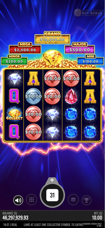 If a Collector lands, but there are not enough coins to activate Hold & Win, a random coin shower can trigger, drenching the reels in all the glitz and glamour you need to sweep you right into H&W! Flashy diamonds, electric payouts, and more power than a gemstone-loaded thunderstorm: Diamond Charge Hold & Win is here to bedazzle your wins!