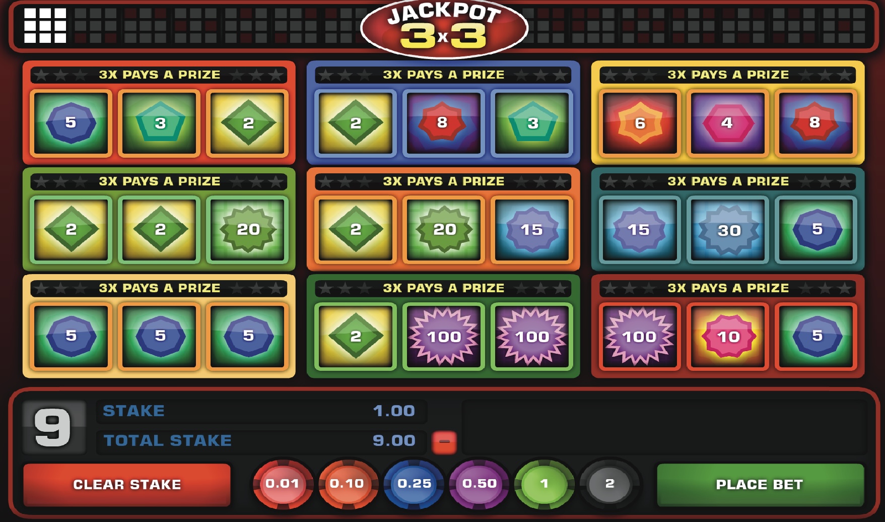 Imagine a slot where your players can play 9 slots at one time… with Jackpot 3X3 you no longer need to imagine. The game has a simple and fun appeal that players will quickly understand, and also has the ability to turn off "unlucky" slots on the 3X3 grid, by selecting it or by choosing from one of the defined patterns. With the top row paying little and often, and the lower row paying the bigger stakes, this game is exciting, generous and fun to play all in one.