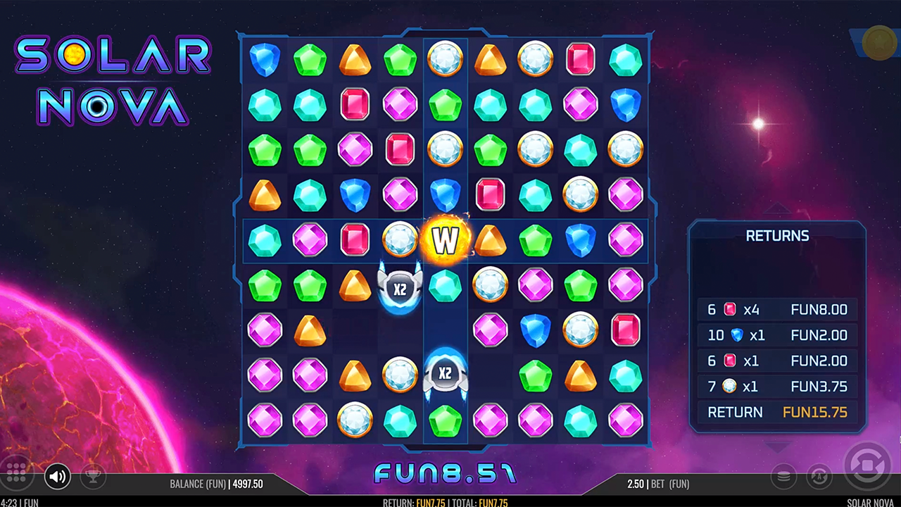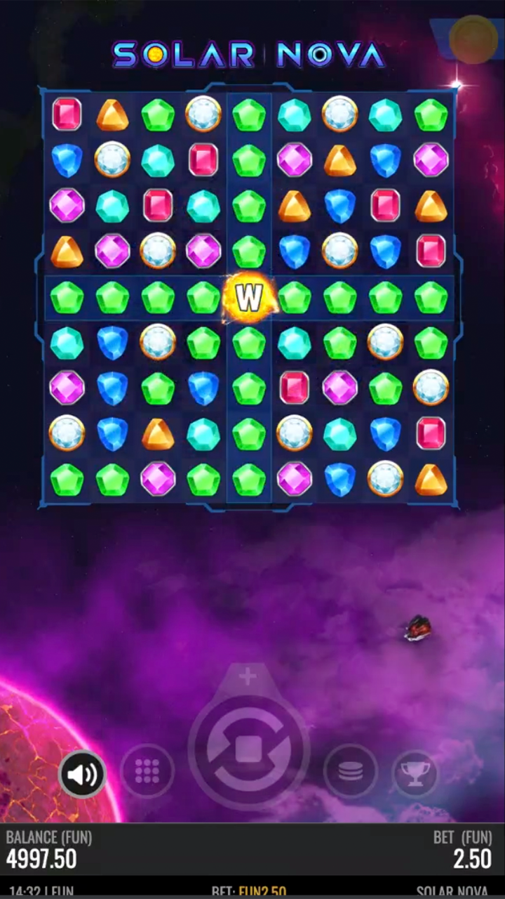 Fire up your rockets and spin your way through outer space in this 9x9 clusters pays slot. Look out for the constant Solar Wild in the middle of the reels. Solar Flares are randomly triggered and transform 1-4 of the cross lines into the same gemstone symbol. Rockets are sticky wilds and increase their multiplier by 1 after each win, 3 or more rockets triggers freespins. Rockets at random may teleport and swap positions with another symbol to guarantee a win. During the freespins Solar Nova expansion occurs when the Solar Wild symbol contributes to 8 wins during FS. The Solar Nova explosion expands the wild symbol into a 3x3 version of itself.