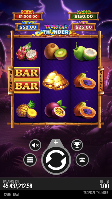 Get ready to be swept away in a delicious whirlwind with Tropical Thunder and enter an exotic fruity paradise bursting with electrifying wins! Set on a paradise island in the Pacific, this 3X3 slot adventure comes with hidden juicy treasures and extra sweet payouts. Starting from the base game, land a Collector and a Cash symbol, and watch as the first gathers all cash values, boosting your rewards.