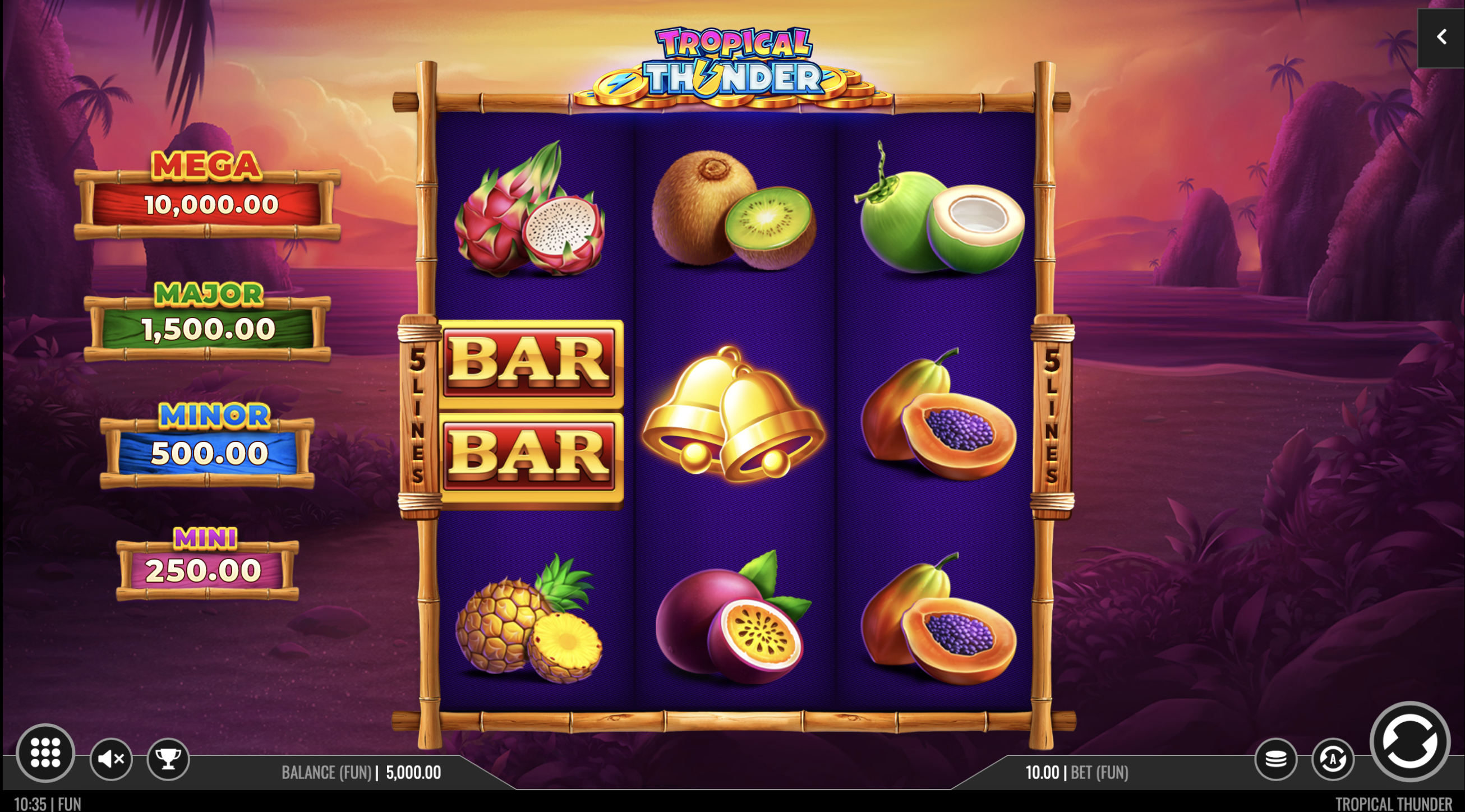 Get ready to be swept away in a delicious whirlwind with Tropical Thunder and enter an exotic fruity paradise bursting with electrifying wins! Set on a paradise island in the Pacific, this 3X3 slot adventure comes with hidden juicy treasures and extra sweet payouts. Starting from the base game, land a Collector and a Cash symbol, and watch as the first gathers all cash values, boosting your rewards.