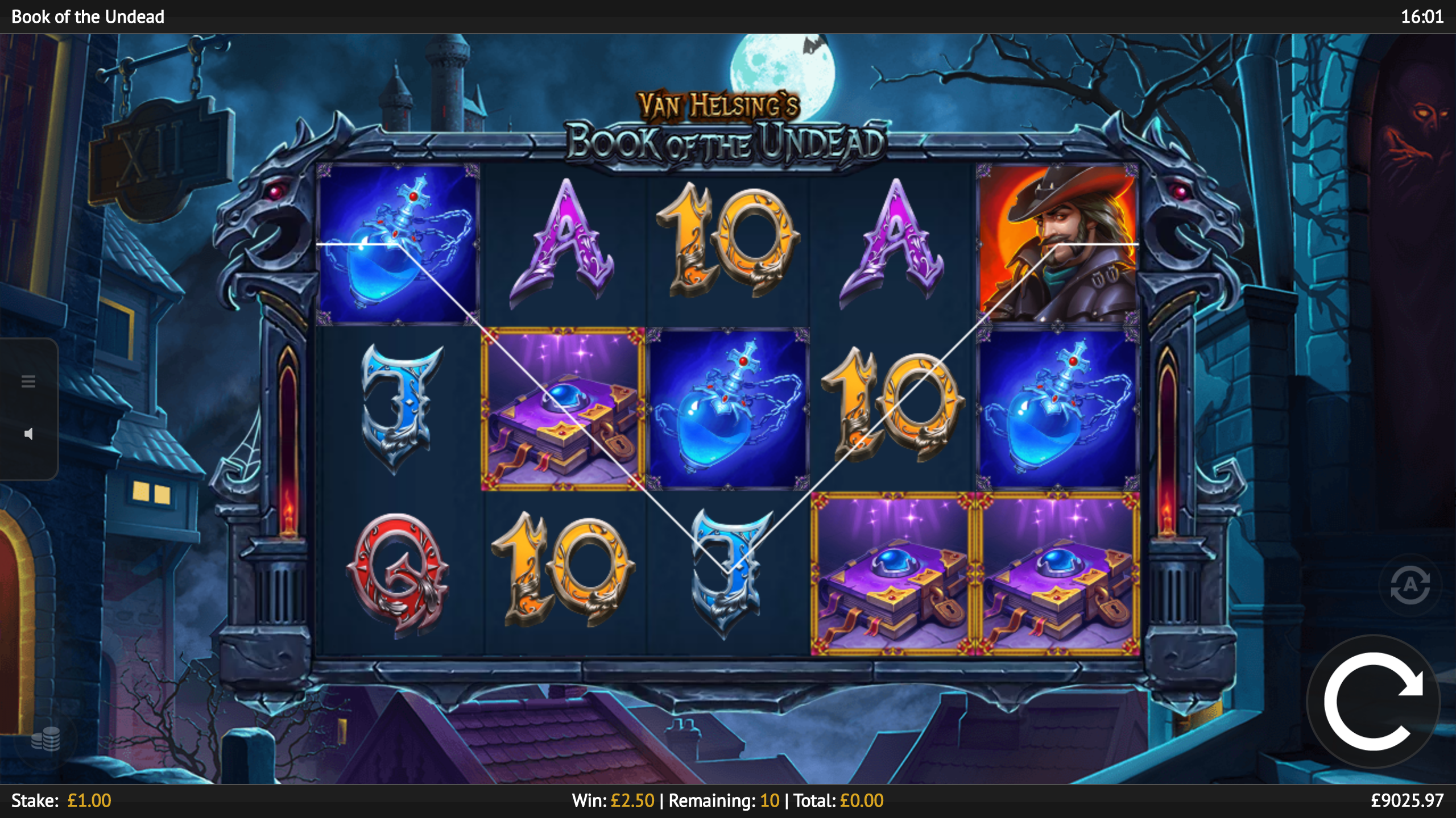 Discover the "Book of the Undead" by 1x2gaming, a classic 5x3 slot game featuring 10 win lines. With this high volatility game, players embark on an epic journey alongside the legendary Vampire Hunter, Van Helsing, as they explore Count Draculas' castle. In the base game, players can start their adventure with a 0.10 bet per spin or take their chances to the next level with the ante bet, (50.0 per spin) to maximize their winning opportunities. During Freespins a non-special symbol will be randomly selected to become the Special expanding symbol. This guarantees big wins of up to 5,100x. Book of the Undead offers an electrifying gameplay experience filled with captivating graphics, including crossbows and Vials of Holy Water.